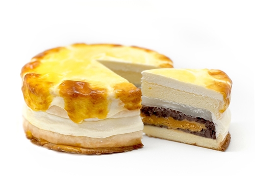 成份 : 乳酪餡(法國鮮奶油、奶油乳酪、砂糖),奶油乳酪(全脂牛奶、乳脂、鹽、刺塊豆膠、玉米糖膠、關華豆膠),戚風蛋糕(雞蛋、牛奶、法國發酵奶油、砂糖、日本低筋麵粉),紅豆餡,鹹蛋黃,雪果子